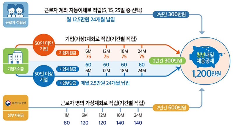 | 가입 1년차 월 14만원 2~3년차에는 월 18만원 납부 총 36개월 + 기업과 정부 각각 600만원 납부 후 만기시 1800원 수령 |