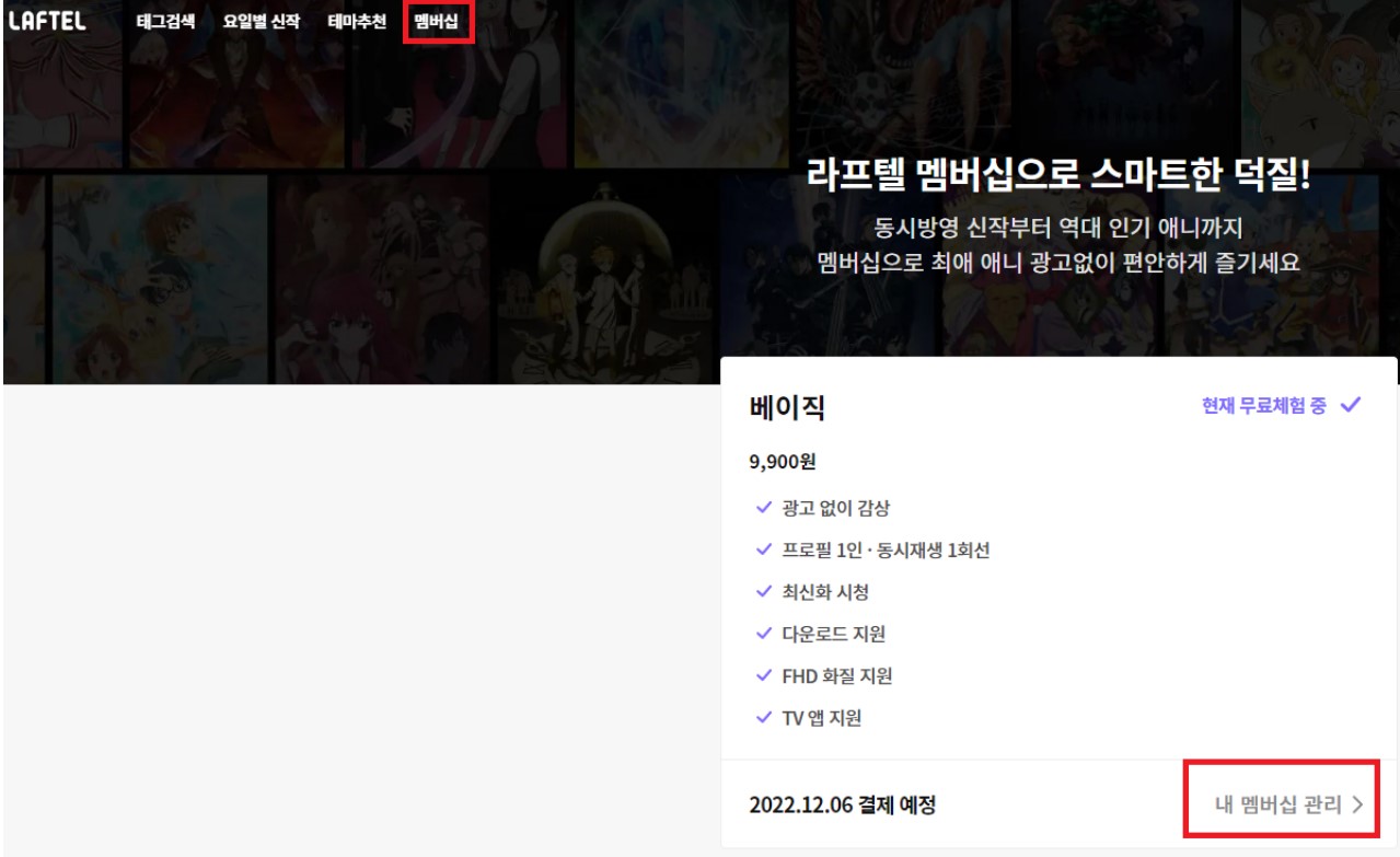 이후, 15일 동안 멤버십 혜택을 무료로 이용할 수 있습니다. 무료체험 기간 동안 사용자는 라프텔의 다양한 애니메이션을 무료로 시청할 수 있으며, 자동 결제 설정을 통해 무료체험이 종료될 때 자동으로 유료 멤버십으로 전환됩니다.
